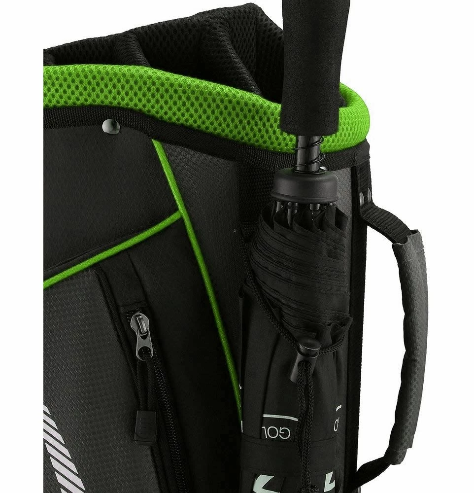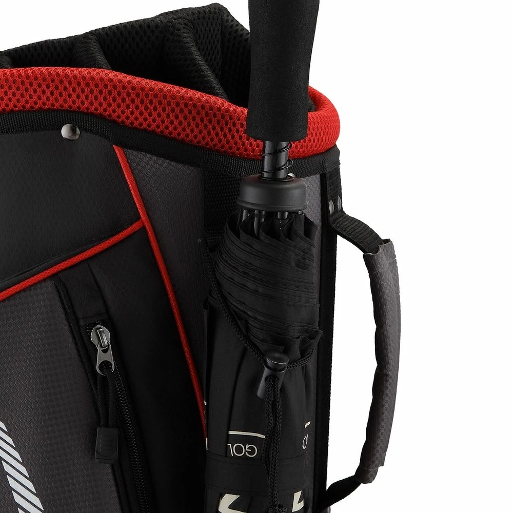 This golf cart bag features 14 club dividers to keep everything organised, as well as an external umbrella holder.