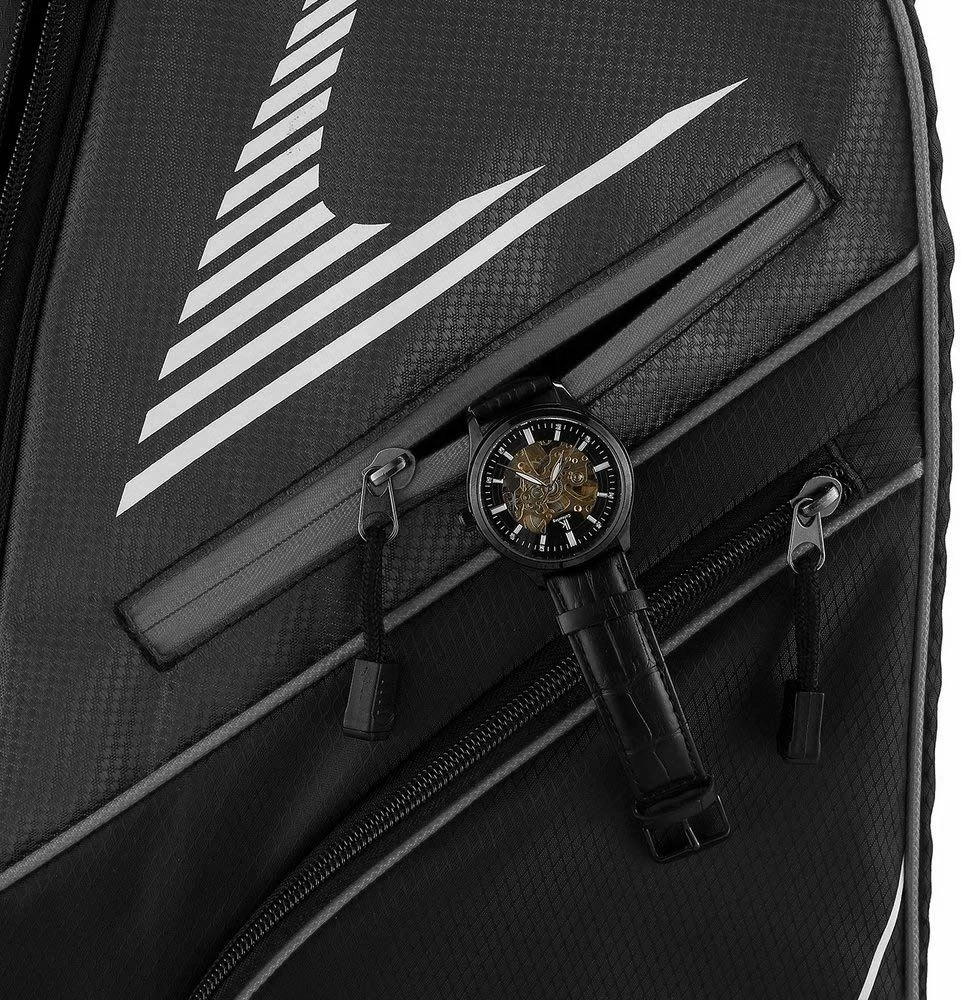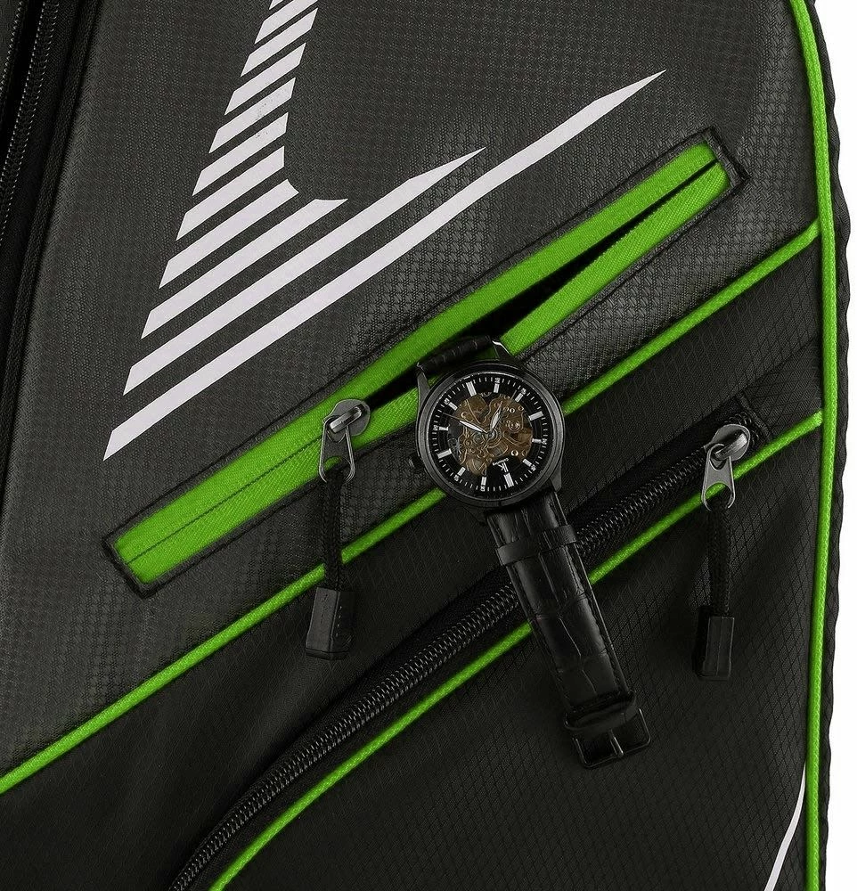 There are plenty of pockets, including 8 zipper pockets, a golf ball pocket, a soft lined valuables pocket, and 2 apparel slots.