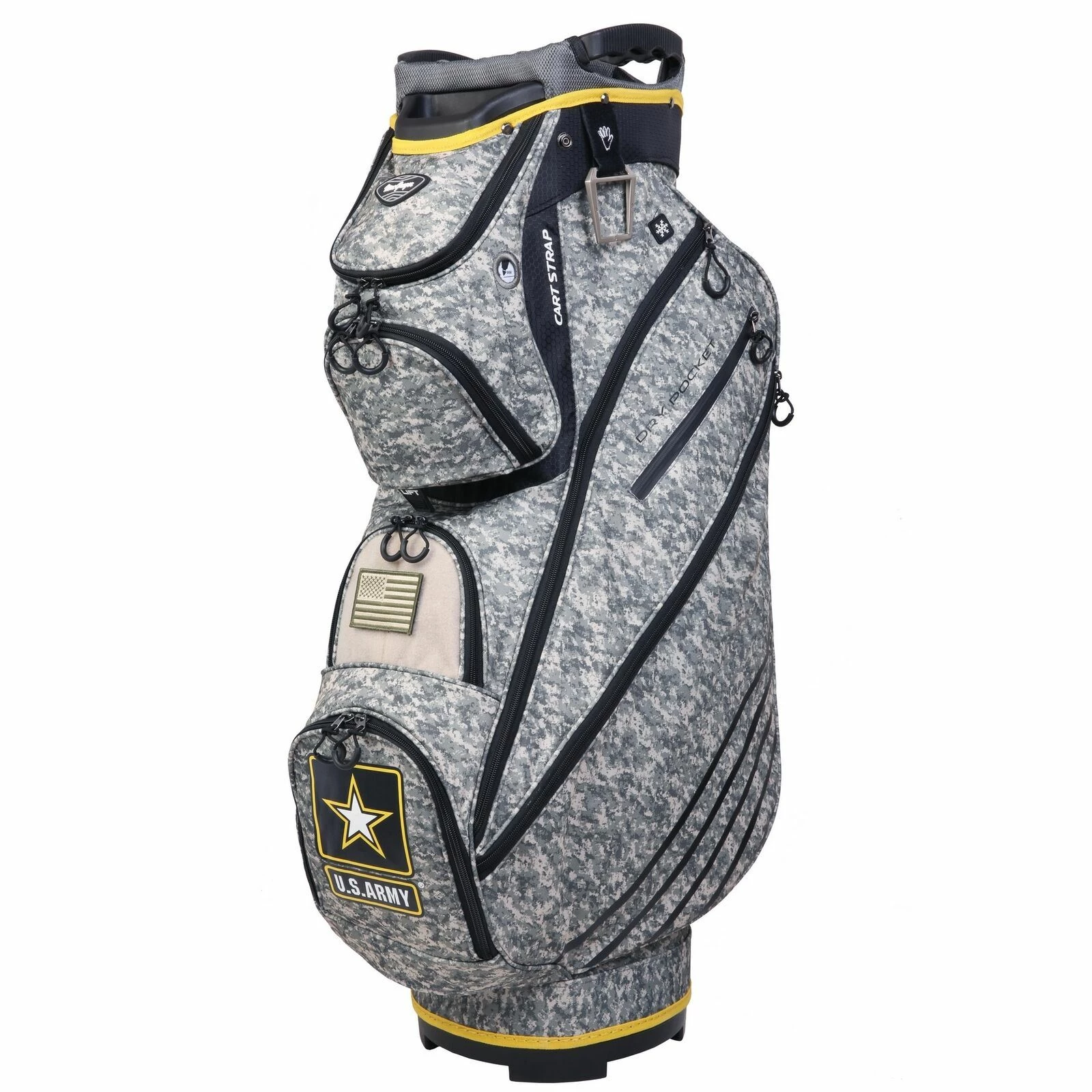 - MORE FEATURES – 10 total pockets / rain hood included / pen holder / Velcro glove holder / towel buckle / external umbrella holder / adjustable carry sling